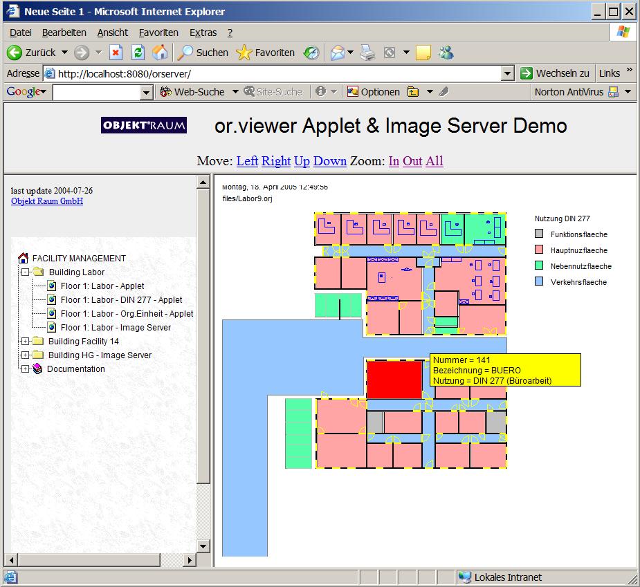 Willkommen in der Objekt Raum Welt! or.java ist ein auf der Programmiersprache Java™ basierender intelligenter grafischer Objekt Browser. or.java bringt schnelle Vektor-Grafik und Daten-Visualisierung ins Internet. or.java ermöglicht volle Kontrolle über Objekte und Beziehungen im Web. or.java 4.0 bringt Server View und neue Document-View-Struktur Die Version 4.0 des grafischen Web-Viewers or.viewer steht ab sofort zur Verfügung. Der or.viewer ist ein intelligenter grafischer Objekt-Viewer in Form eines Applets. Reale Objekte (wie z.B. Räume, Flächen, Inventarien, ..) und ihre Beziehungen (z.B. Inventar gehört zu Raum) können mittels Vektor-Grafik abgebildet werden. Der or.serverview ist eine Webserverkomponente, mit deren Hilfe dynamisch Images (GIF) aus Vektorgrafik erzeugt werden können. Damit ist es auch von einfachen Webclients möglich, auf grafische Informationen zuzugreifen. Verschaffen Sie sich einen Überblick über or.java, die Technologie, die Objekte und Beziehungen grafisch im Internet/Intranet abbildet. |